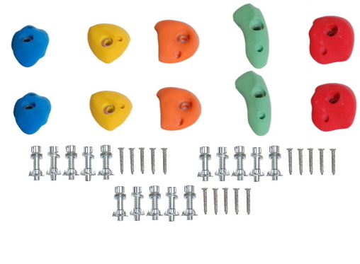 Our set of 10 polyresin strong assorted rock climbing wall holds is designed to add a twist to an already existing playset, jungle gym, climbing frame, climbing wall or swingset, or as climbing rocks replacements. These rock climbing holds will inspire and motivate kids to get up and get moving, they would help improving concentration and sense of balance!