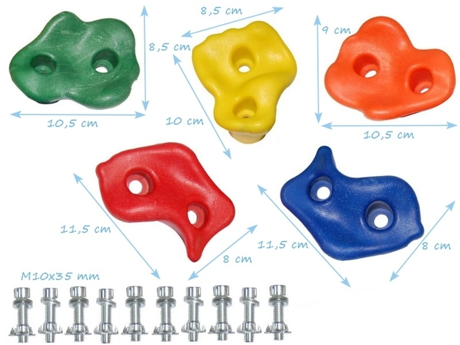 Our set of 15 strong plastic assorted rock climbing wall holds is designed to add a twist to an already existing playset, jungle gym, climbing frame, climbing wall or swingset, or as climbing rocks replacements. These rock climbing holds will inspire and motivate kids to get up and get moving, they would help improving concentration and sense of balance!